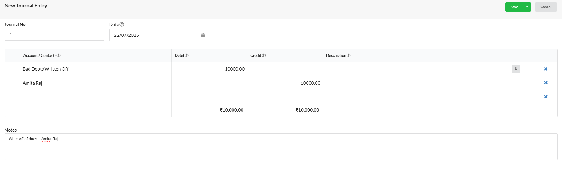 Scenario: Amita Raj was invoiced Rs. 10,000 on credit on 1st April 2025. On 22nd July 2025, the business determined that the debt is unrecoverable and needs to record it as a bad debt.