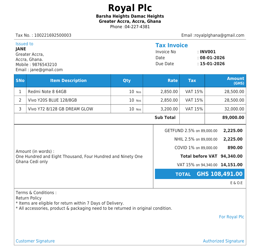 Output Books supports this calculation model to ensure accurate invoicing and compliance with Ghana Revenue Authority (GRA) requirements.